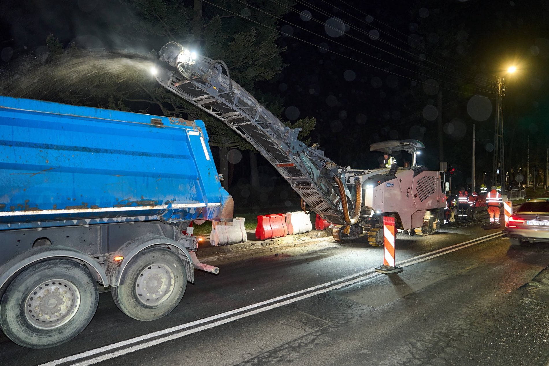 To wymagający odcinek - jezdnia jest wąska, a ruch między osiedlami duży. Dlatego układanie nowej nawierzchni jest realizowane nocami.