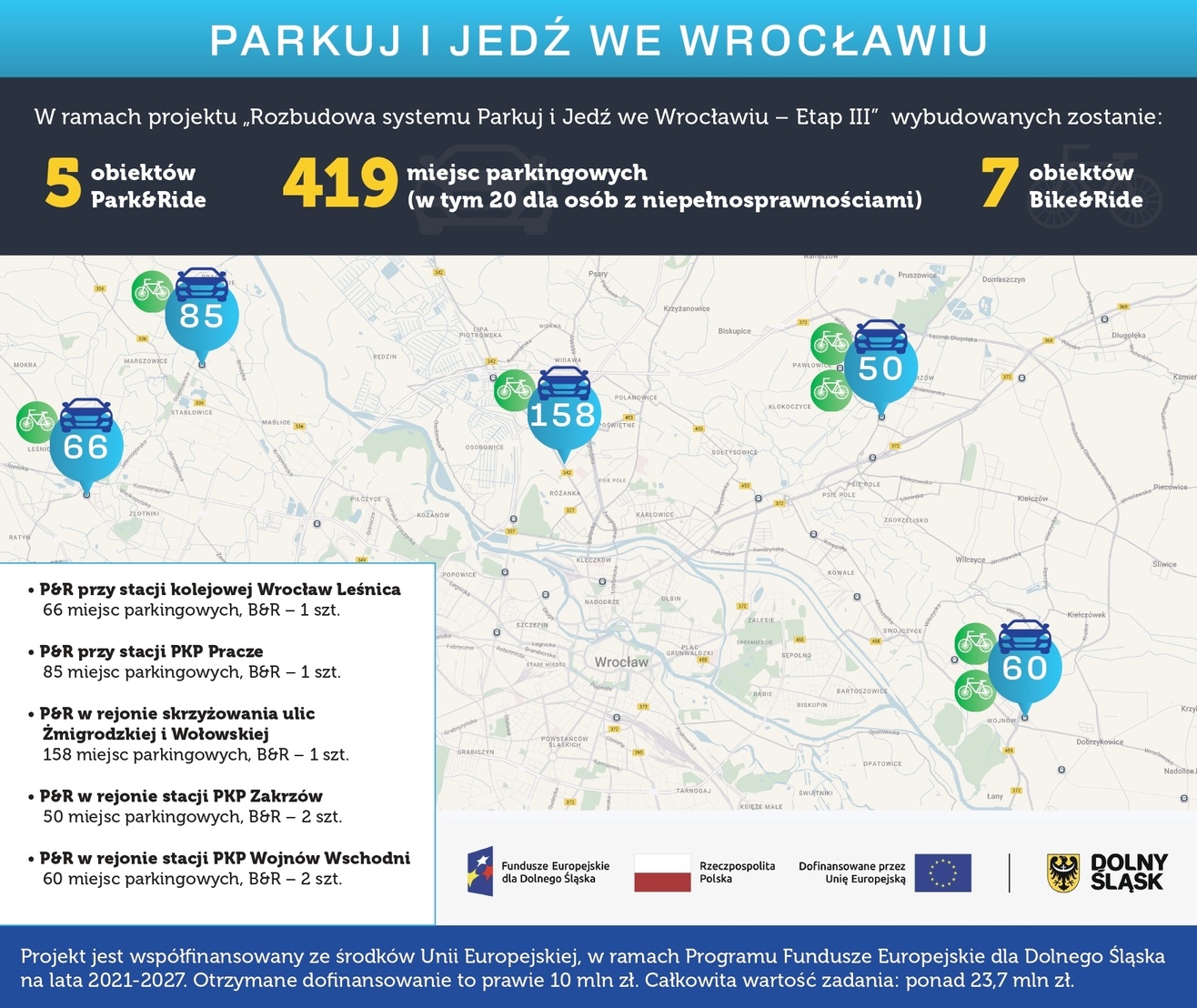 Budowa parkingu Park&Ride przy stacji kolejowej w Leśnicy już trwa i ma się zakończyć do lata. Natomiast termin realizacji pozostałych parkingów, wraz z przygotowaniem dokumentacji projektowej, wynosi od 13 do 18 miesięcy od podpisania umowy z wykonawcą.