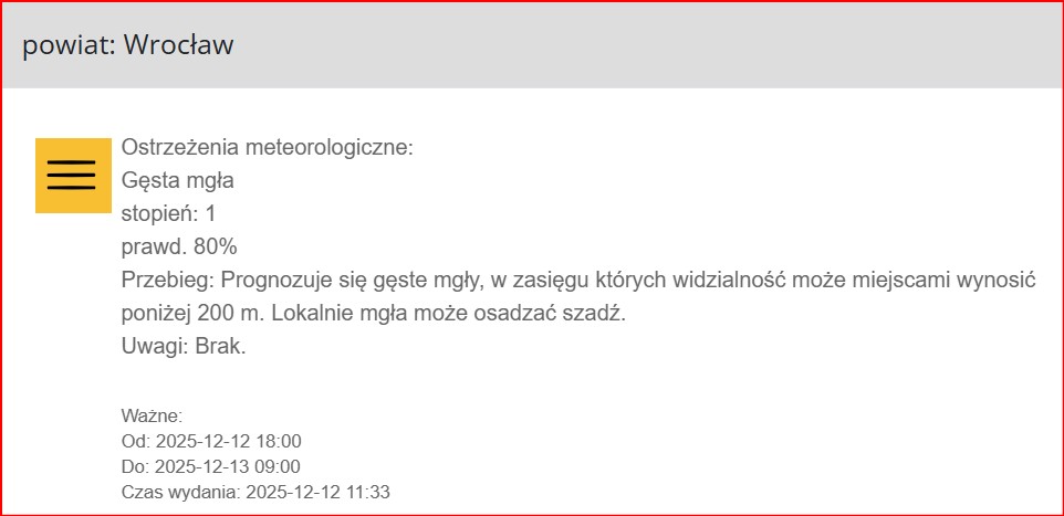 Instytut Meteorologii i Gospodarki Wodnej – Państwowy Instytut Badawczy wydał ostrzeżenie 1 stopnia przed gęstą mgłą, które dotyczy także Wrocławia. Prawdopodobieństwo pojawienia się ngly określono na 80 proc.