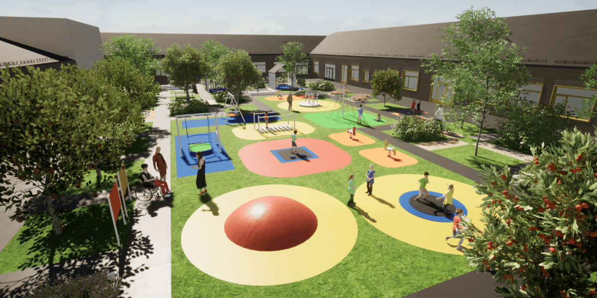 Na terenie szkoły powstanie bezpieczny wewnętrzny dziedziniec z ogrodem sensorycznym, placem zabaw i miejscami do odpoczynku. Zaplanowano także ogród warzywny, szklarnie oraz łąkę kwietną z domkami dla owadów. Będzie dużo przestrzeni do nauki, sportu i rekreacji.
