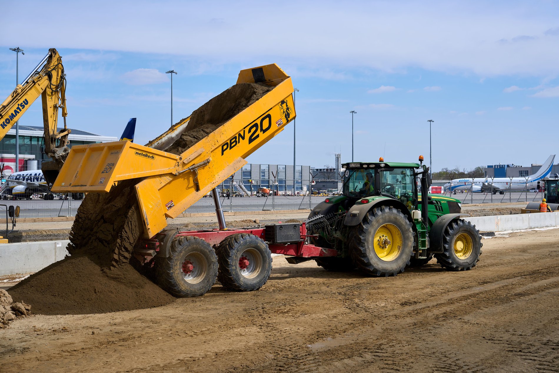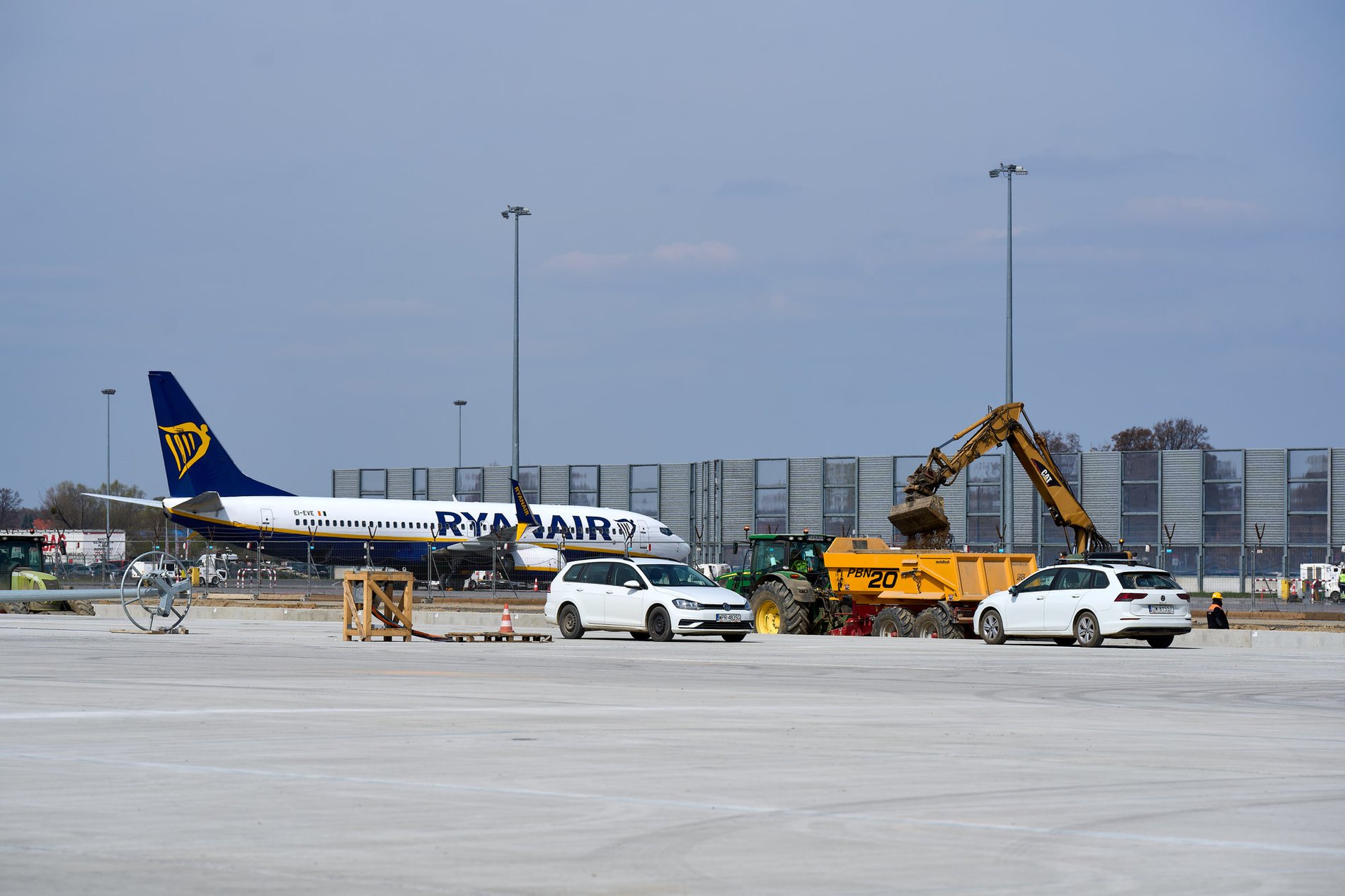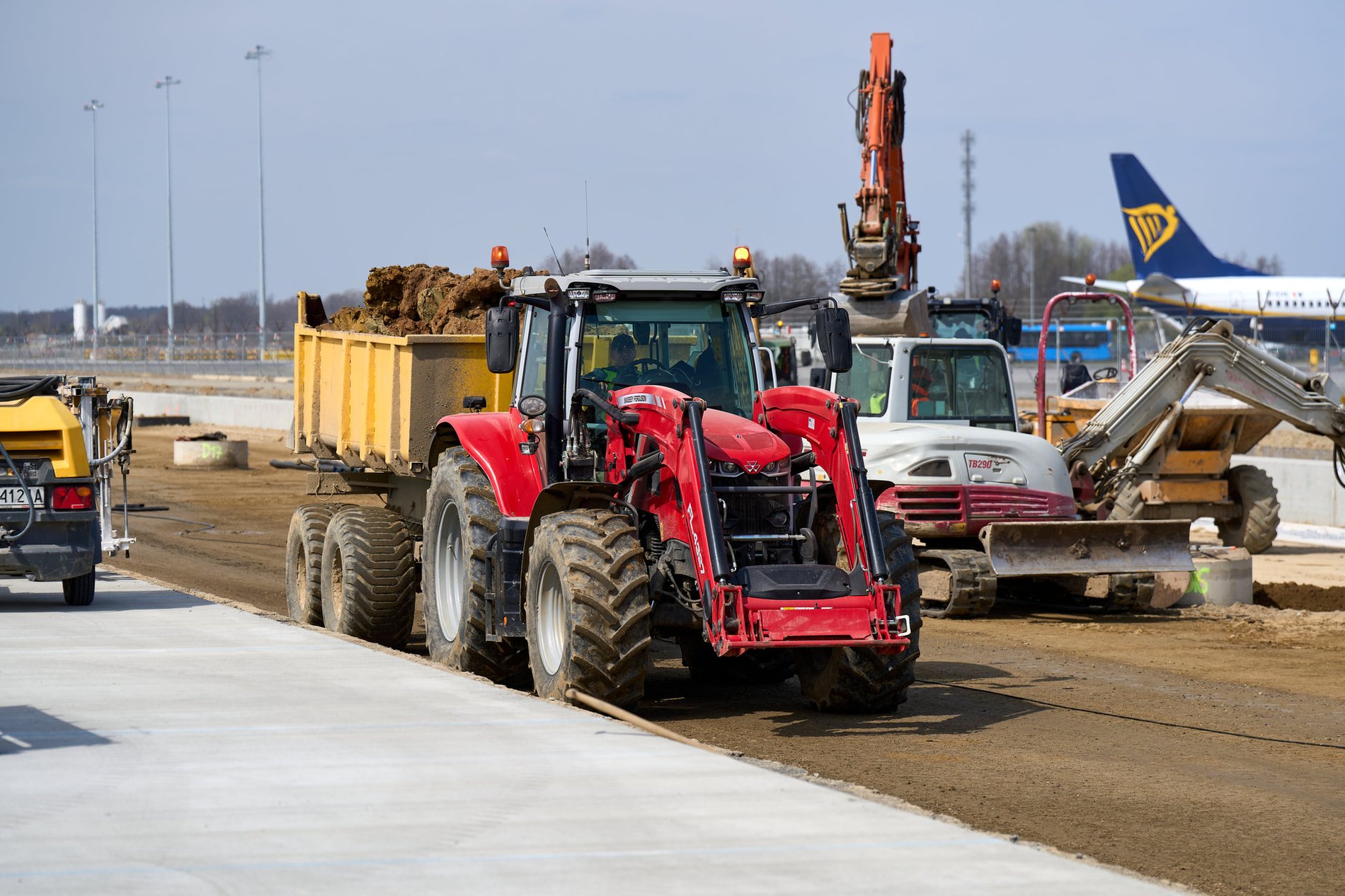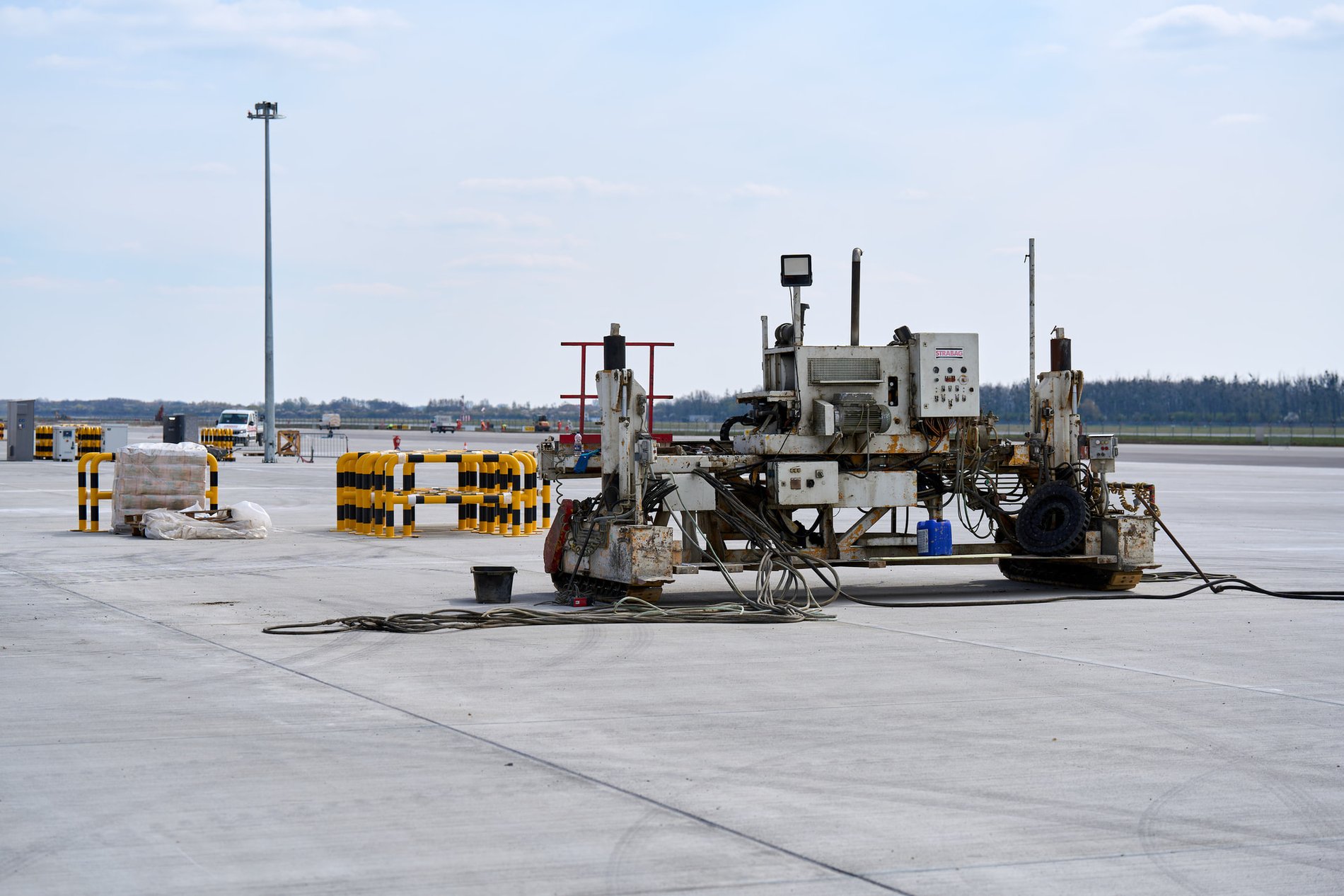 W czasie naszej wizyty widoczne na zdjęciu maszyny zajmowały się głównie remontem istniejącej drogi kołowania. Wielkie powierzchnie gładkiej jak stół masy bitumicznej to nowa droga kołowania i płyta postojowa.