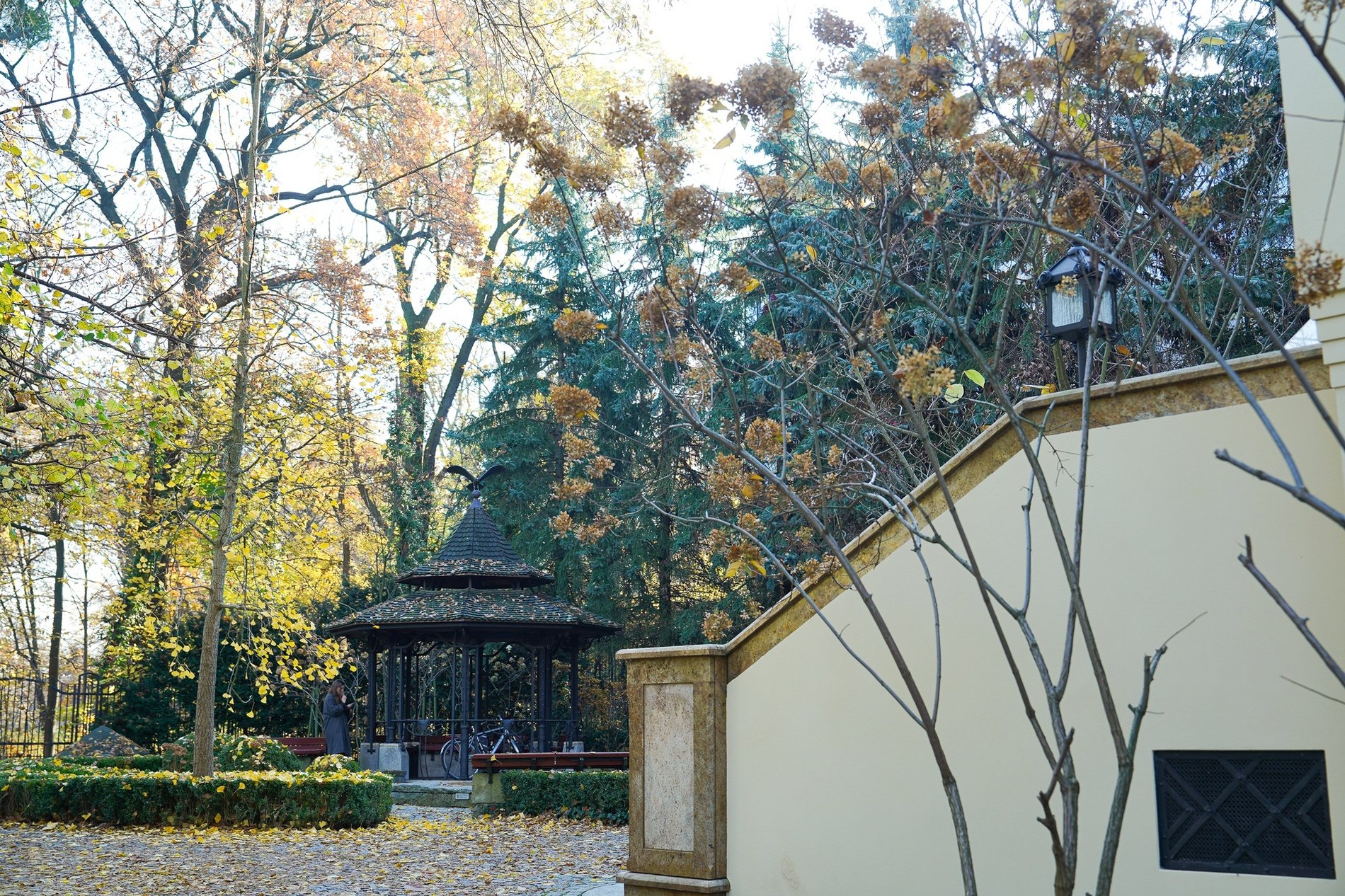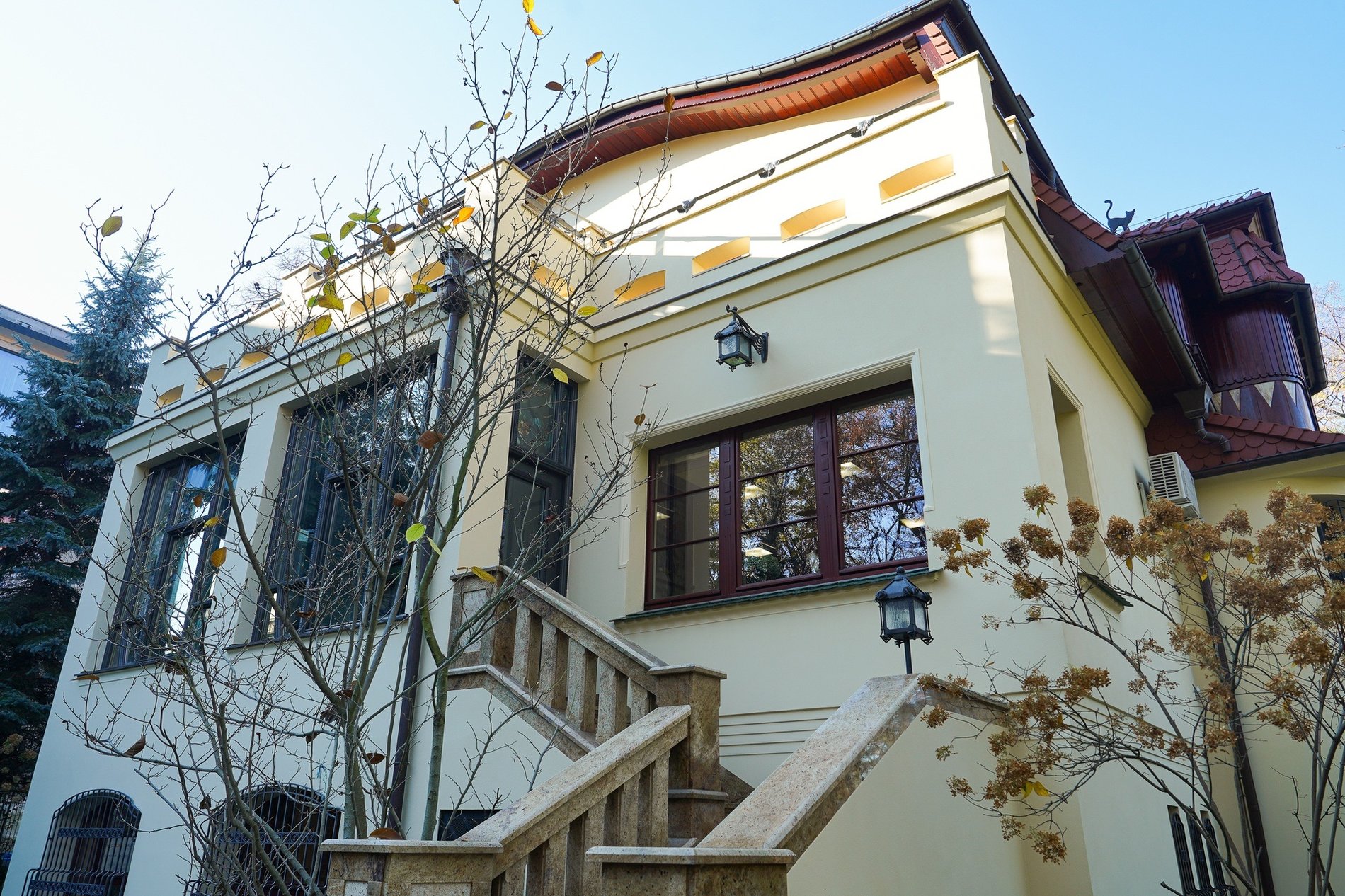 Od frontu budynek dostał werandę zadaszoną drewnianymi balkonami. Od północy dostawiono sień wejściową z niedużym dachem mansardowym. Od zachodu był taras otoczony murowaną balustradą. Samą elewacją urozmaicono wykuszowymi oknami, a jej górną partię pokryto drewnianymi gontami. Z kolei od południa umieszczono wykusz owalny z wyciętym oknem inspirowanym kształtem tradycyjnego okna termalnego.