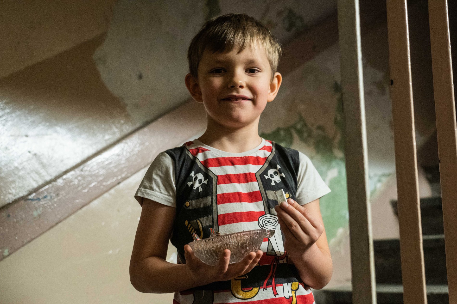 Rozmawiamy z grupą mieszkańców przy windzie na parterze. Dokładnie w miejscu, gdzie farba odznacza się na ścianach. Malowanie kończy się przy schodach, po których w kapciach schodzi kilkuletni chłopiec. Wpadł poczęstować nas cukierkami.