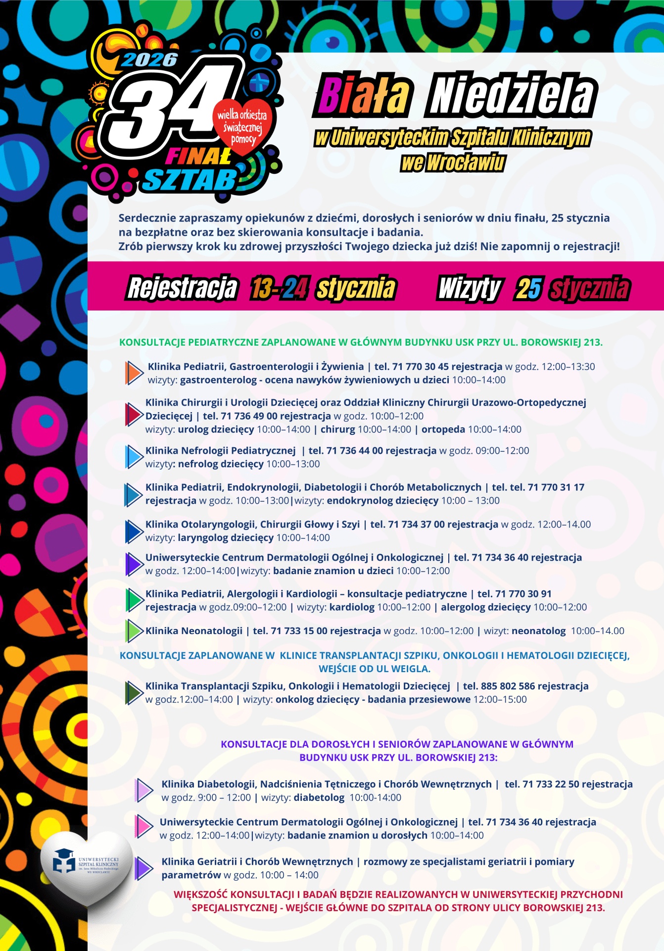 W dniu 34. Finału WOŚP – w niedzielę 25 stycznia – USK przy ul. Borowskiej we Wrocławiu organizuje Białą Niedzielę i zaprasza dzieci oraz dorosłych na bezpłatne (i bez skierowania) konsultacje i badania. Rejestracja chętnych trwa do 24 stycznia, szczegóły tutaj.