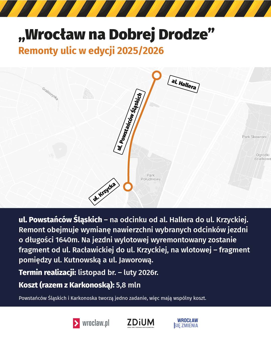Powstańców Śląskich to kluczowa arteria naszego miasta, która zasługuje na najwyższe standardy drogowe. Korzystając z trwającej modernizacji odcinka brukowanego, chcemy poprawić stan techniczny dalszych odcinków. Zastąpimy wykruszającą się, spękaną nawierzchnię nowym asfaltobetonem, który oznacza nie tylko komfortową, bezpieczną jazdę, ale również całkowitą szczelność i odporność na warunki zimowe. Prace rozplanowaliśmy tak, aby utrudnienia były jak najmniejsze.Tomasz Staruchowicz, dyrektor Zarządu Dróg i Utrzymania Miasta we Wrocławiu