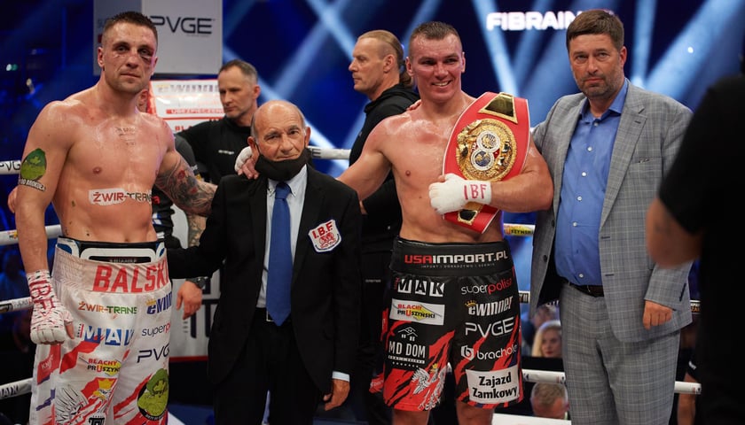 Adam Bąkalski i Mateusz Masternak (z pasem zwycięzcy) po walce w Rzeszowie
