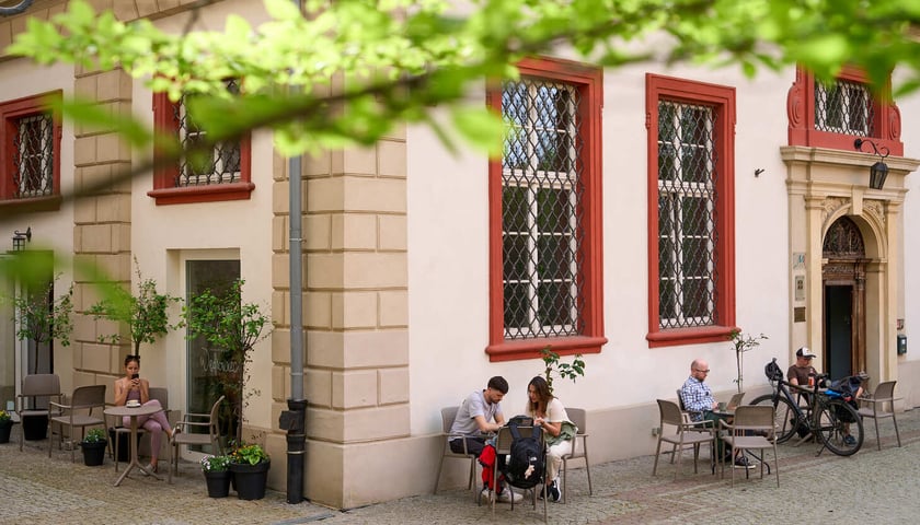 Widok na ludzi siedzących przed kawiarnią Cherubinowy Wędrowiec