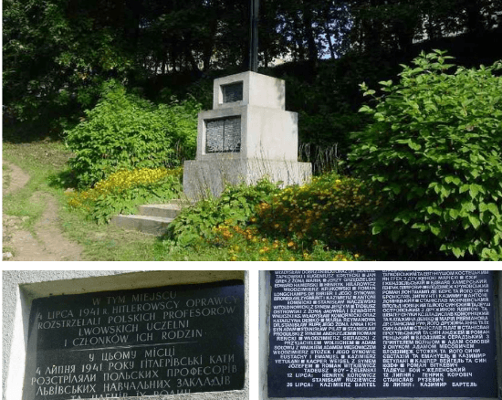 3 lipca 2011 r., w przeddzień 70. rocznicy kaźni lwowskich uczonych, na miejscu ich egzekucji, odsłonięty zaś został pomnik projektu krakowskiego rzeźbiarza Aleksandra Śliwy. Ma on formę bramy, wzniesionej z prostych granitowych bloków. Na każdym z nich z nich wyryty jest numer przykazania z Dekalogu. Blok z rzymską cyfrą V (Nie zabijaj!) został wysunięty z konstrukcji, co sugeruje jej zawalenie – symbol cywilizacji, niszczejącej na skutek łamania praw Dekalogu. Za bramą jest ściana śmierci z przejściem, nad którym przybita jest, jakby wyrwana z notesu, kartka z odręcznie napisanym po niemiecku słowem „rozstrzelać!”.