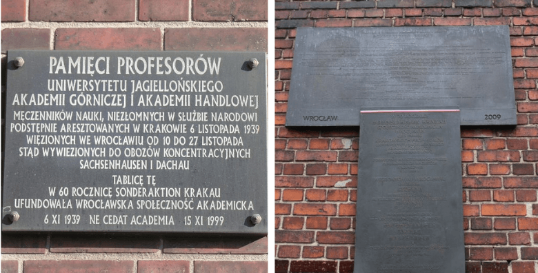 Po lewej: tablica pamiątkowa przy ul. Sądowej, na murze, który łączy budynek sądu z więzieniem przy ul. Świebodzkiej (ufundowana przez wrocławskie środowisko akademickie), została odsłonięta w dniu Święta Nauki Wrocławskiej 15 listopada 1999 r. (żródło: wikipedia, Bonio, CC BY-SA 3.0.). Po lewej: tablica na murze więzienia przy ul. Kleczkowskiej zawisła w (od strony ul. Reymonta) zawisła 15 listopada 2009 r. – w 70. rocznicę Sonderaktion Krakau. Napis brzmi: „W 70. rocznicę Sonderaktion Krakau wrocławska społeczność akademicka czci pamięć krakowskich profesorów Uniwersytetu Jagiellońskiego, Akademii Górniczej, Akademii Handlowej podstępnie aresztowanych przez hitlerowskich nazistów w Krakowie 6 XI 1939 r. , więzionych w ówczesnym Breslau przy ul. Kleczkowskiej i ul. Świebodzkiej w dniach 10–27 XI 1939 r., skąd ich droga wiodła do obozów koncentracyjnych Sachsenhausen, Dachau i Mauthausen, przynosząc śmierć 21 profesorów. Nigdy nie zapomnimy męczeństwa polskich naukowców, 6 XI 1939 – Ne Cedat Academia – 15 XI 2009”