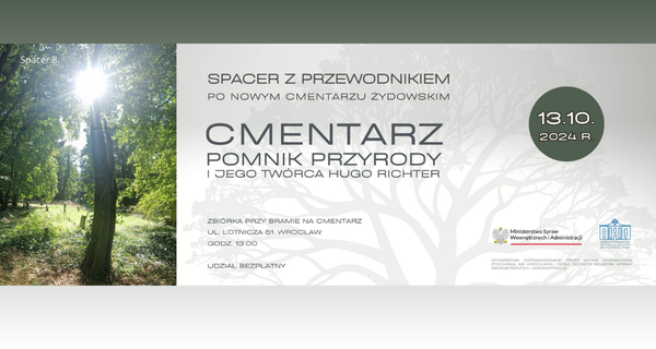 Nowy Cmentarz przy ul. Lotniczej we Wrocławiu to miejsce mające wielką wartość dla żydowskiej społeczności tego miasta. Już 13 października, wszyscy zainteresowani dziejami Żydów w naszym regionie, będą mogli lepiej poznać jego historię. Tematem oprowadzania będzie charakter Nowego Cmentarza Żydowskiego jako pomnika przyrody. Uczestnikom zostanie także przybliżona postać projektanta nekropolii, Hugona Richtera.