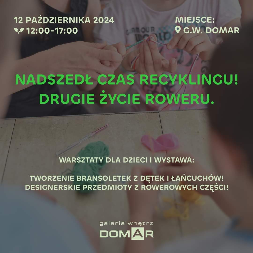 Zapraszamy na ekologiczne warsztaty rozwijające kreatywność, promujące ekologię i inspirujące do nadawania nowego życia przedmiotom! Już 12 października Wasze dzieci będą mogły dowiedzieć się, jak dbać o rower, by służył jak najdłużej, a także jak kreatywnie wykorzystać zużyte części rowerowe!