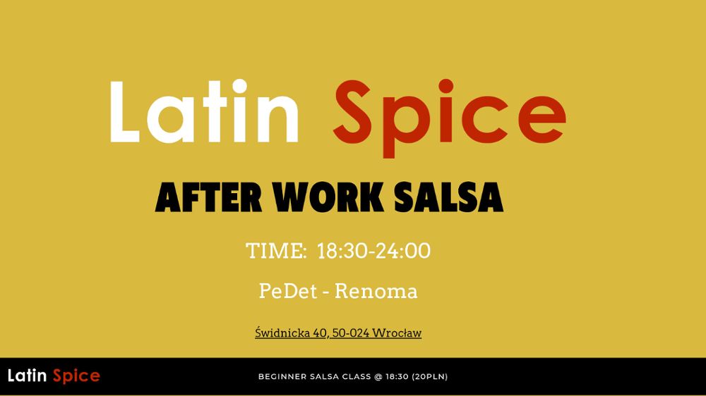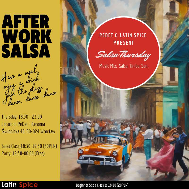 Organizatorem wydarzenia jest Latin Spice we współpracy z Pedet Renoma. Możecie przyjść solo, z partnerem lub partnerką – na parkiecie na pewno znajdziecie kogoś, kto podziela Waszą pasję do tańca! DJ zadba o gorącą atmosferę i zagra latynoskie rytmy, takie jak Salsa Romantica, Timba, Son, Salsa Dura oraz Mambo.