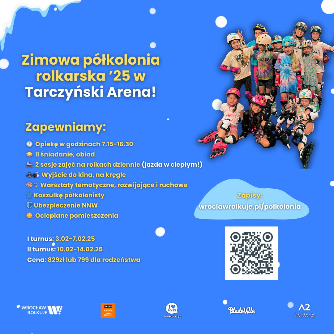 Zapraszamy dzieci w wieku 5–13 lat na rolkowe półkolonie na Tarczyński Arena! Jesteśmy szkołą rolkową, która od ponad 5 lat uczy dzieci jazdy na rolkach. Od 2019 roku nieprzerwanie organizujemy półkolonie i obozy dla dzieci i młodzieży. W 2025 roku również zapraszamy na nasze rolkowe półkolonie!