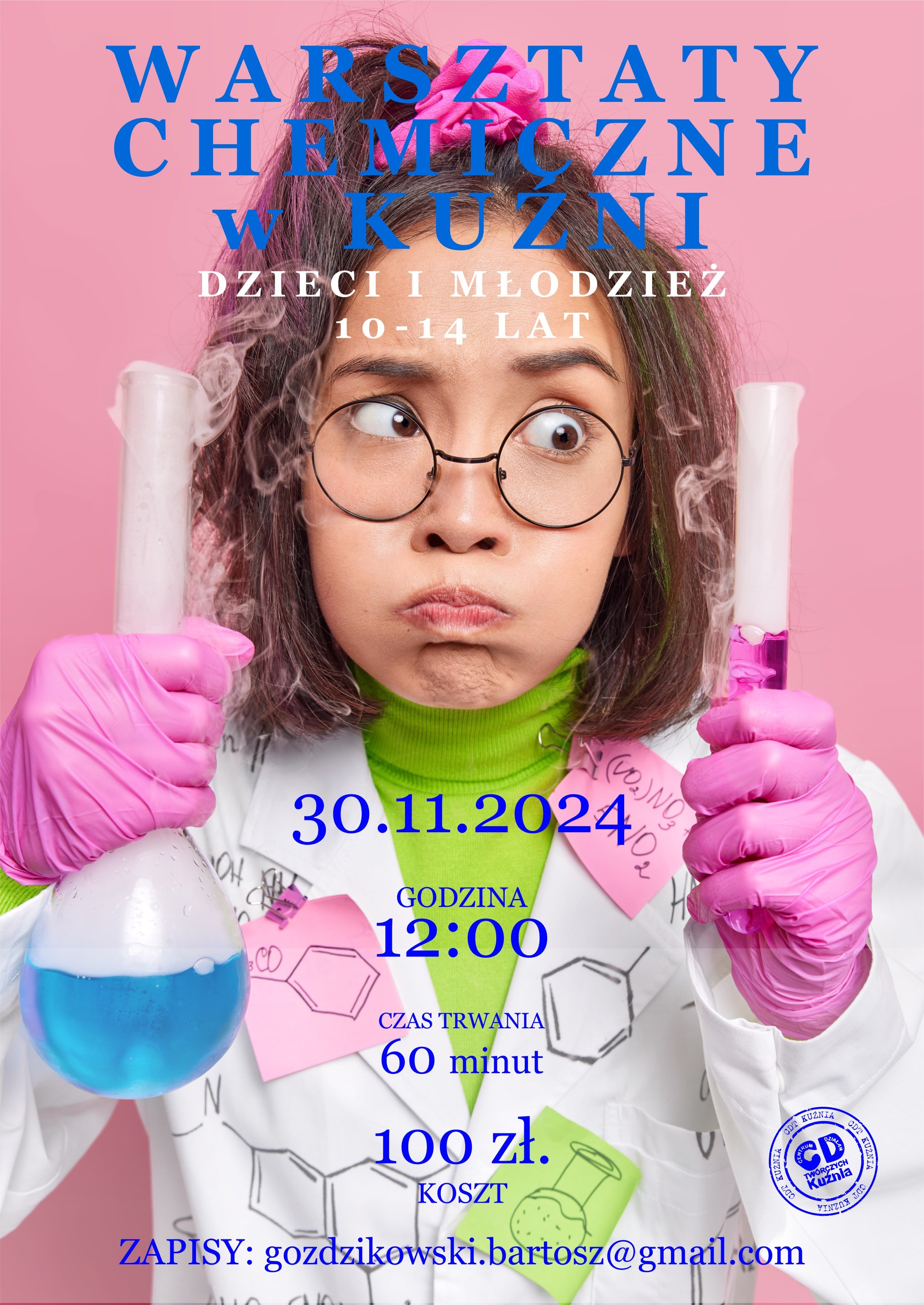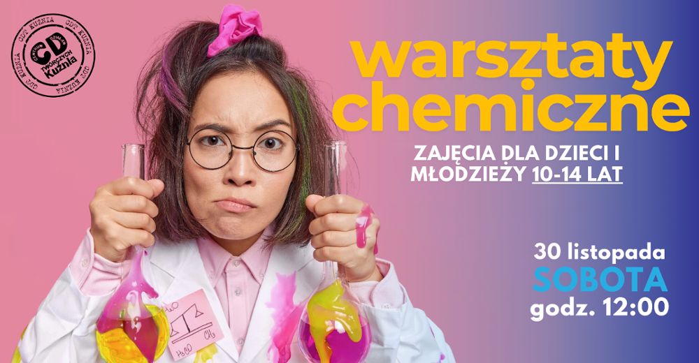 Serdecznie zapraszamy na pierwsze Warsztaty Chemiczne dla dzieci i młodzieży w wieku 10–14 lat, które odbędą się w CDT Kuźnia już 30 listopada (sobota) o godzinie 12:00. Zajęcia poprowadzą niezastąpione Biochemki, zapewniając uczestnikom niezapomnianą podróż w świat nauki – pełen pasji, fascynujących eksperymentów i wybuchowej zabawy!