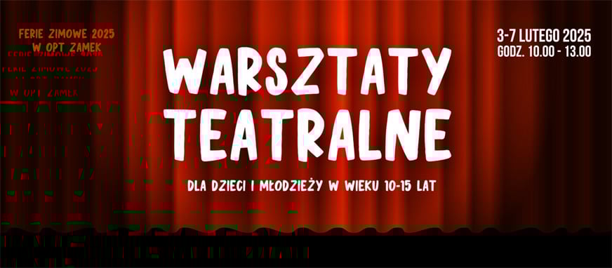 Zapraszamy na warsztaty teatralne dla dzieci i młodzieży, które będą odbywać się w ferie zimowe! W dniach 3–7 lutego 2025 roku, w godzinach 10:00–13:00, w naszym Zamku zrealizowane zostaną wyjątkowe warsztaty teatralne skierowane do dzieci i młodzieży w wieku 10–15 lat (klasy 4–8 szkoły podstawowej). To doskonała okazja na spędzenie ferii w kreatywny sposób!