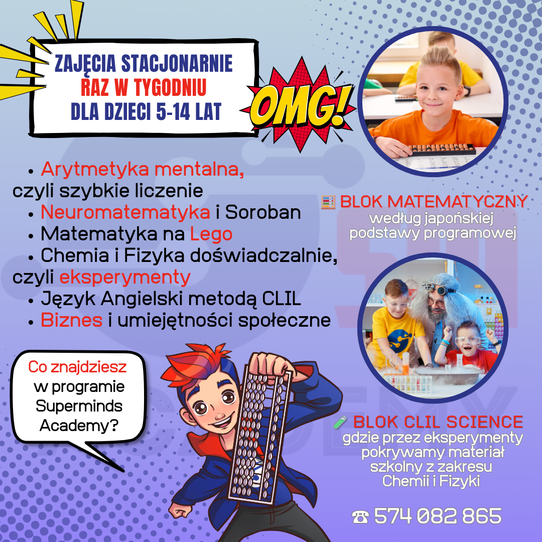 Superminds Academy to wyjątkowe zajęcia dodatkowe, które odbywają się stacjonarnie raz w tygodniu.