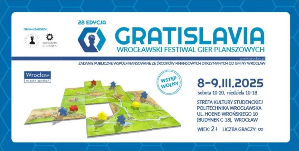 Wrocławski Festiwal Gier Planszowych GRATISLAVIA zaprasza na dwa dni znakomitej zabawy przy grach planszowych. Impreza jest skierowana do wszystkich – od przedszkolaków po seniorów. Do ich dyspozycji będą setki tytułów w wypożyczalni festiwalowej (do rozegrania na miejscu) oraz na stoiskach wystawców – przedstawicieli czołowych polskich wydawnictw gier planszowych, którzy zaprezentują premierowe i przedpremierowe nowości.
