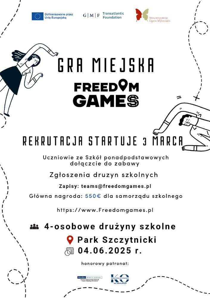 Gra miejska Freedom Games odbędzie się 4 czerwca 2025 r., w Parku Szczytnickim, w Dniu Wolności i Praw Obywatelskich. Planujemy udział 200 uczestniczek/uczestników zrekrutowanych z wrocławskich szkół ponadpodstawowych. Tematyka zadań będzie dotyczyła społeczeństwa obywatelskiego, praworządności, praw człowieka i obywatela, wolności słowa, zasad trójpodziału władzy. Wszystkie zadania odnoszą się do historycznych miejsc na mapie Wrocławia.