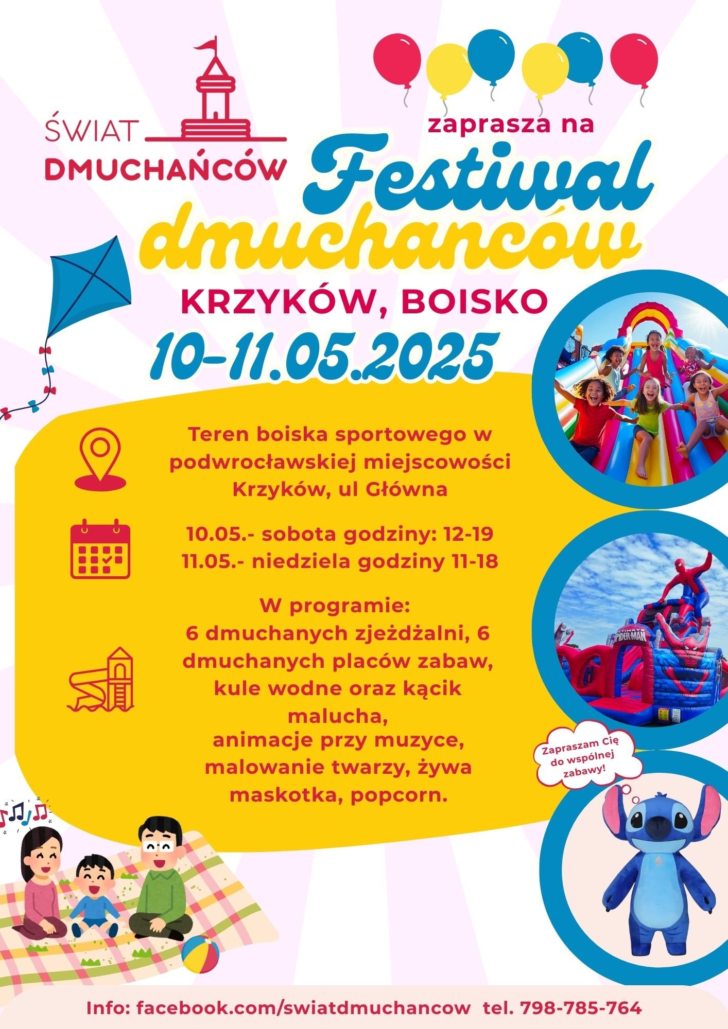Serdecznie zapraszamy w dniach 10–11 maja 2025 r. wszystkie dzieci wraz z rodzinami na boisko sportowe w Krzykowie, gdzie odbędzie się Festiwal Dmuchańców.