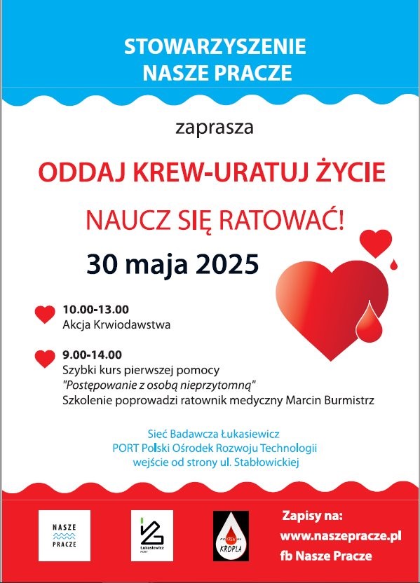 Stowarzyszenie Nasze Pracze zaprasza na Akcję Oddaj krew – uratuj życie. Naucz się ratować Druga edycja akcji krwiodawstwa na Praczach Odrzańskich we współpracy z Łukasiewicz - PORT. Warto obdarować bliskich i bliźnich czymś szczególnym – niech to będzie jedyny niepowtarzalny lek – krew, której nie można wyprodukować w laboratorium. Dodatkowo, przez cały czas trwania akcji, szybki kurs pierwszej pomocy.