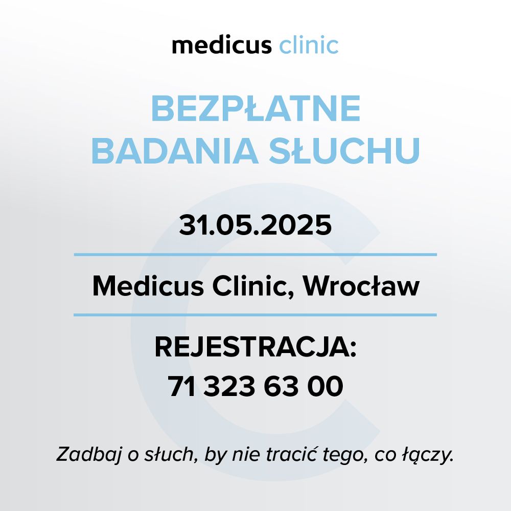 W sobotę 31 maja 2025 roku Medicus Clinic we Wrocławiu zaprasza mieszkańców Wrocławia i okolic na kolejną edycję Białej Soboty – akcji bezpłatnych badań słuchu i konsultacji specjalistycznych. Wydarzenie ma na celu zwiększenie świadomości problemu niedosłuchu i zachęcenie do wczesnej diagnostyki.