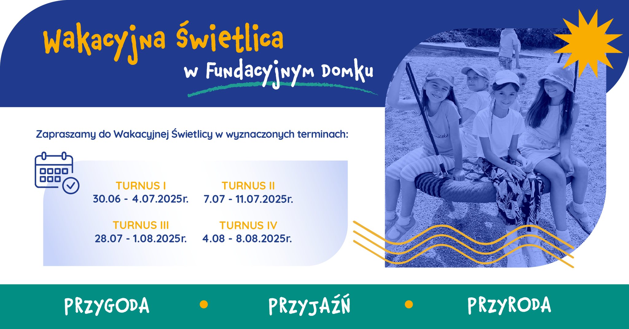 Pod hasłem „przygoda, przyjaźń, przyroda” zapraszamy dzieci na Wakacyjną Świetlicę – wspólne odkrywanie świata przez kontakt z naturą i działania twórcze.