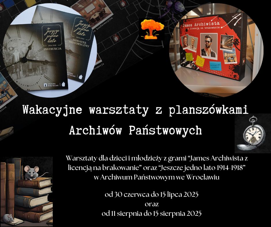 „James Archiwista z licencją na brakowanie”, w której odkryjecie tajniki pracy archiwisty i zmierzycie się z niecodziennymi wyzwaniami. Wykonacie misje specjalne, takie jak: poszukiwanie w archiwalnych aktach i odkrywanie ich sekretów oraz projektowanie i tworzenie własnej pieczęci do zabezpieczania tajnej korespondencji. Rozwiążecie zagadki i podejmiecie wyzwania, które wprowadzą Was w fascynujący świat archiwalnych tajemnic.