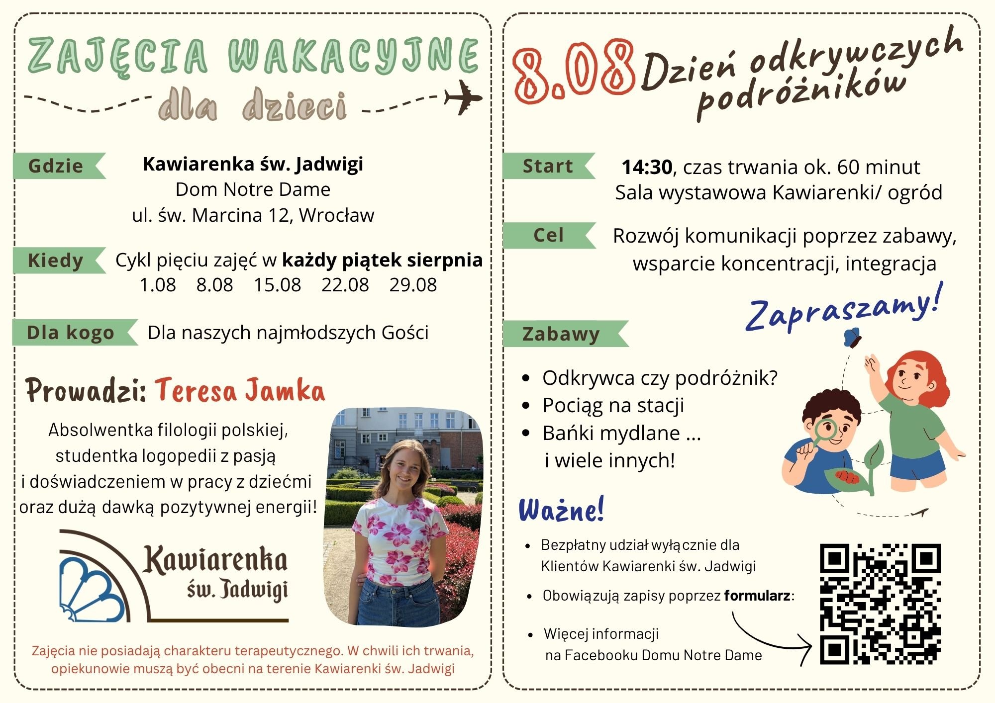 To okazja dla dzieci do spędzenia wolnego czasu na nauce i zabawie, lecz także dla rodziców do chwili wypoczynku w Kawiarence św. Jadwigi. Co będziemy robić? Będzie ciekawie, będzie zabawnie, a przede wszystkim aktywnie i wesoło! Wszystkie ćwiczenia odbywają się w formie gier, zabaw i kreatywnych aktywności, które wspierają rozwój mowy i wyobraźnię dzieci. Nie zabraknie śmiechu, ruchu i zaskoczeń!