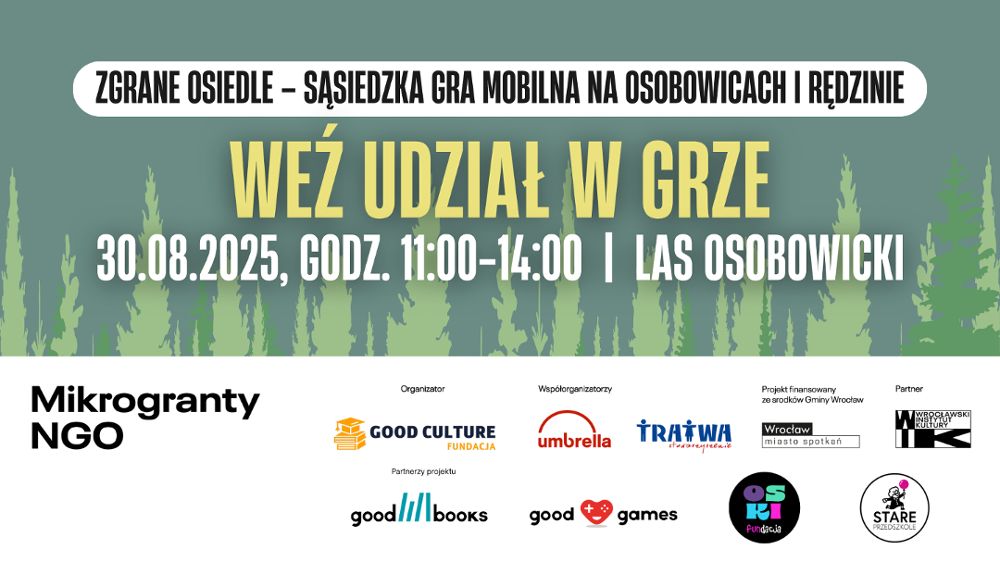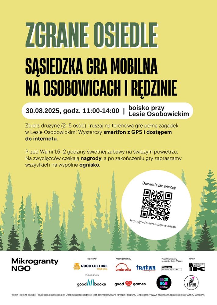 Projekt realizuje Fundacja Good Culture we współpracy z Fundacją Oski (Stare Przedszkole Osobowice – Rędzin). Projekt „Zgrane osiedle – sąsiedzka gra mobilna na Osobowicach i Rędzinie” dofinansowany jest w ramach Programu „Mikrogranty NGO” ze środków Gminy Wrocław.