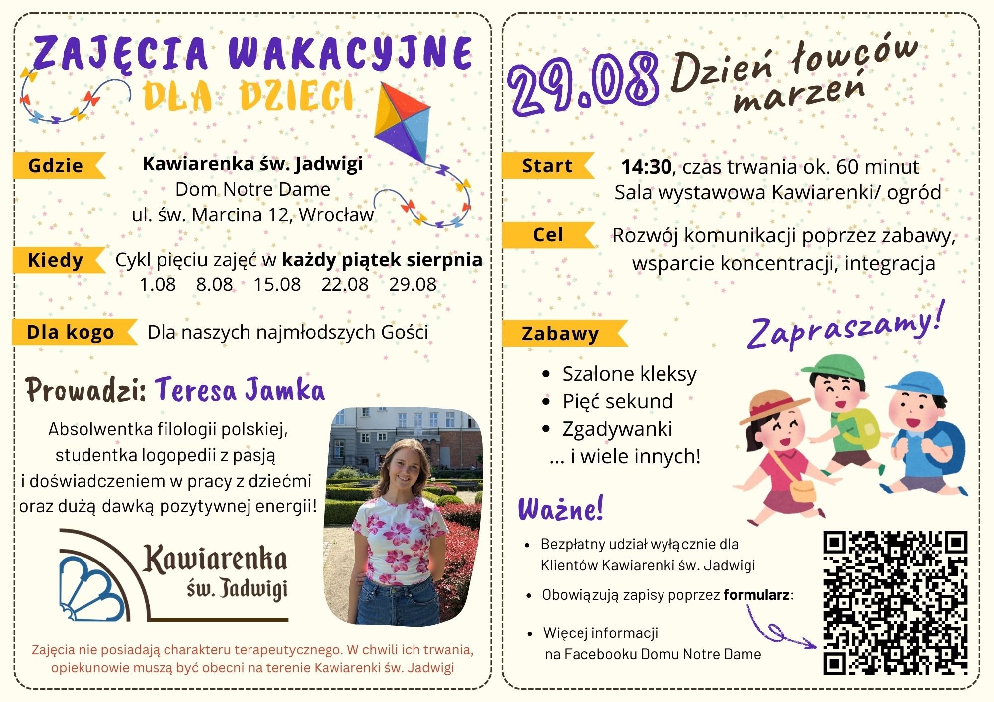 Zajęcia wakacyjne dla dzieci w Kawiarence św. Jadwigi, to okazja do miłego spędzenia czasu dla całej rodziny! Na najmłodszych gości czekają edukacyjne gry i zabawy, a na starszych przepyszne, domowe wypieki oraz filiżanka aromatycznej kawy.