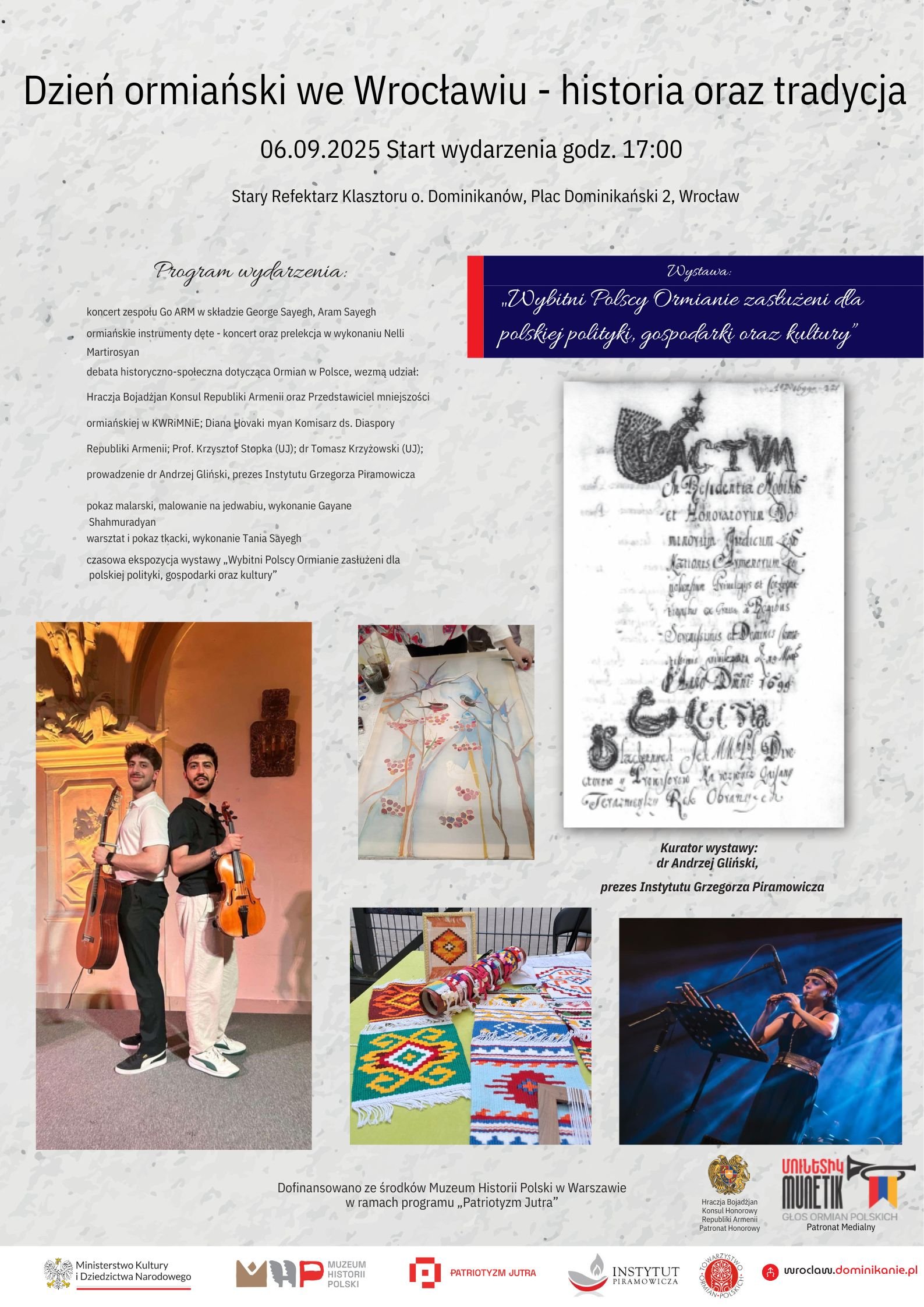 • Debata historyczno-społeczna dotycząca Ormian w Polsce, wezmą udział: Hraczja Bojadżjan (Konsul Republiki Armenii10 oraz przedstawiciel mniejszości ormiańskiej w KWRiMNiE; Diana Hovakimyan (Komisarz ds. Diaspory Republiki Armenii); Prof. Krzysztof Stopka (UJ); dr Tomasz Krzyżowski (UJ). Prowadzenie dr Andrzej Gliński, prezes Instytutu Grzegorza Piramowicza.