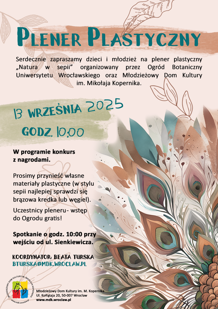 Wrzesień to ostatnia okazja, aby wziąć udział w plenerowych działaniach. Zatem w sobotę 13 września o godz. 10:00 Młodzieżowy Dom Kultury im. Mikołaja Kopernika zaprasza do udziału w Plenerze Plastycznym współorganizowanym z Ogrodem Botanicznym Uniwersytetu Wrocławskiego.
