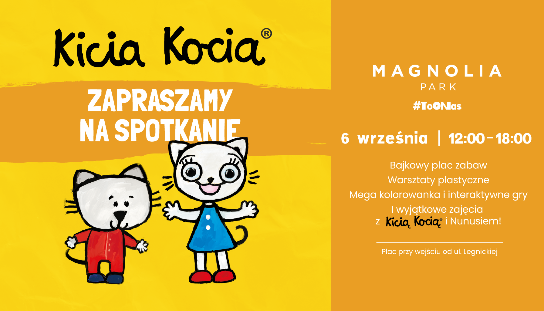 W najbliższą sobotę, 6 września, w godzinach 12:00–18:00, najmłodsi klienci centrum handlowego Magnolia Park będą mieli okazję spotkać bohaterów serii książek Anity Głowińskiej: tytułową kotkę Kicię Kocię i jej młodszego brata Nunusia oraz wziąć udział w pełnym atrakcji wydarzeniu.