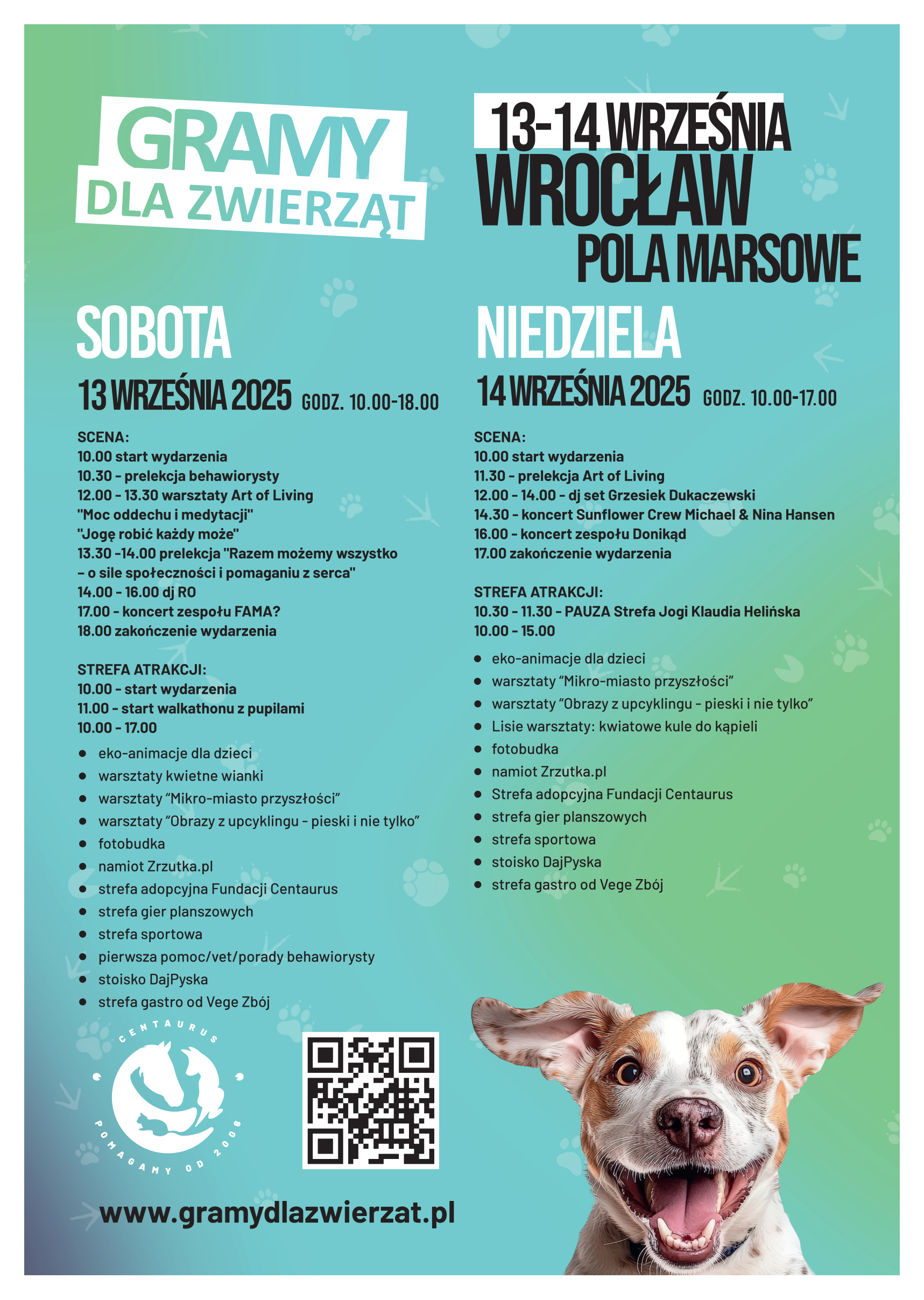 Wrocławski finał odbędzie 13 i 14 września na Polach Marsowych, a w programie m.in. koncerty, dj-sety, warsztaty edukacyjne i kreatywne, spotkania z behawiorystami, animacje dla dzieci i charytatywny walkathon z pupilami. Na uczestników czeka rownież charytatywny kiermasz, strefa sportowa, zajęcia z jogi czy zwierzolubna fotobudka.