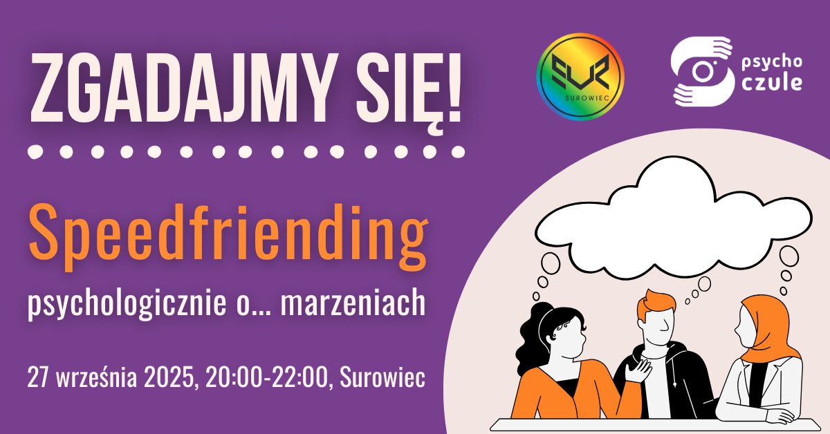 Wydarzenie rozpocznie się od krótkiej prelekcji, podczas której posłuchasz o marzeniach z perspektywy psychologicznej. To motyw przewodni piątego speedfriendingu w ramach cyklu “Zgadajmy się!” współorganizowanego przez Psychoczule i Surowiec.