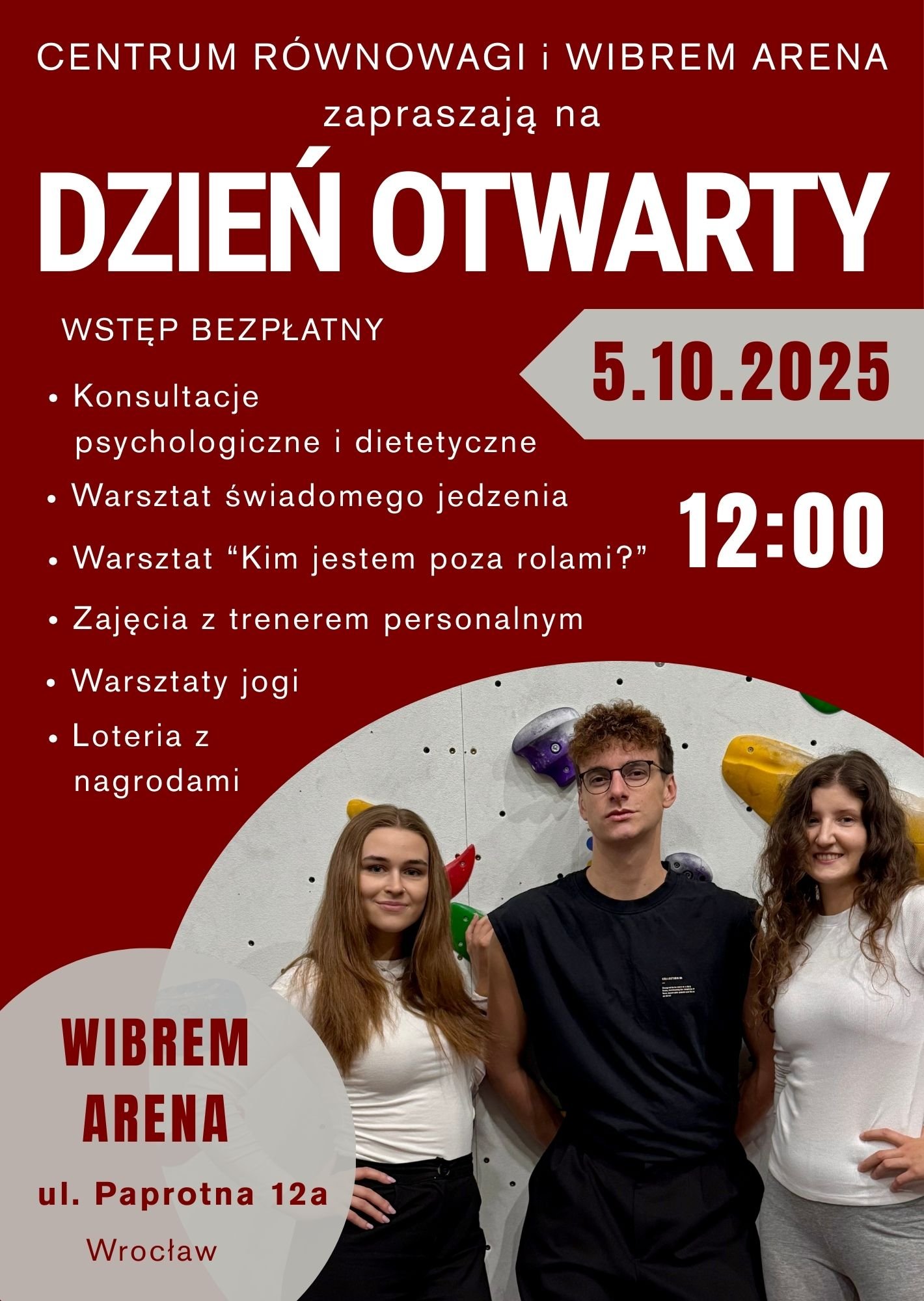 Zapraszamy na Dzień Otwarty gabinetu dietetyczno-psychologicznego Centrum Równowagi. To przestrzeń stworzona przez dwóch psychologów i dietetyka w jednym z największych obiektów wspinaczkowo-szkoleniowych w Europie- centrum wspinaczkowym Wibrem Arena na ul. Paprotnej 12a we Wrocławiu.