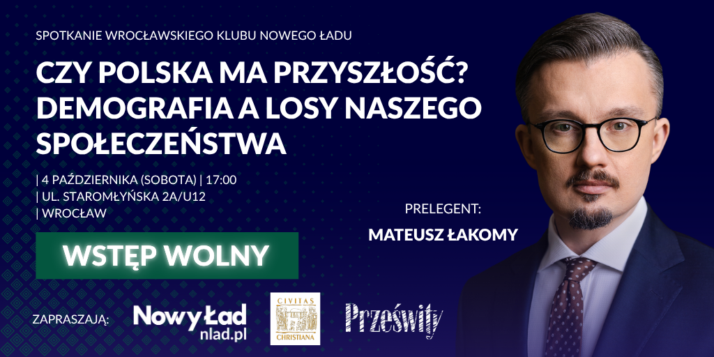 Klub Nowego Ładu we Wrocławiu zaprasza! Już 4 października spotykamy się na wyjątkowej rozmowie z Mateuszem Łakomym, autorem książki „Demografia jest przyszłością” wydanej przez Wydawnictwo Prześwity. Porozmawiamy o przyszłości Polski w kontekście kryzysu demograficznego naszej Ojczyzny. Demografia to nie tylko statystyka – to pytanie o przyszłość kraju, o wyzwania związane z dzietnością, starzeniem się społeczeństwa i migracjami. Podczas spotkania zastanowimy się, jakie konsekwencje niosą te procesy i co mogą oznaczać dla Polski.