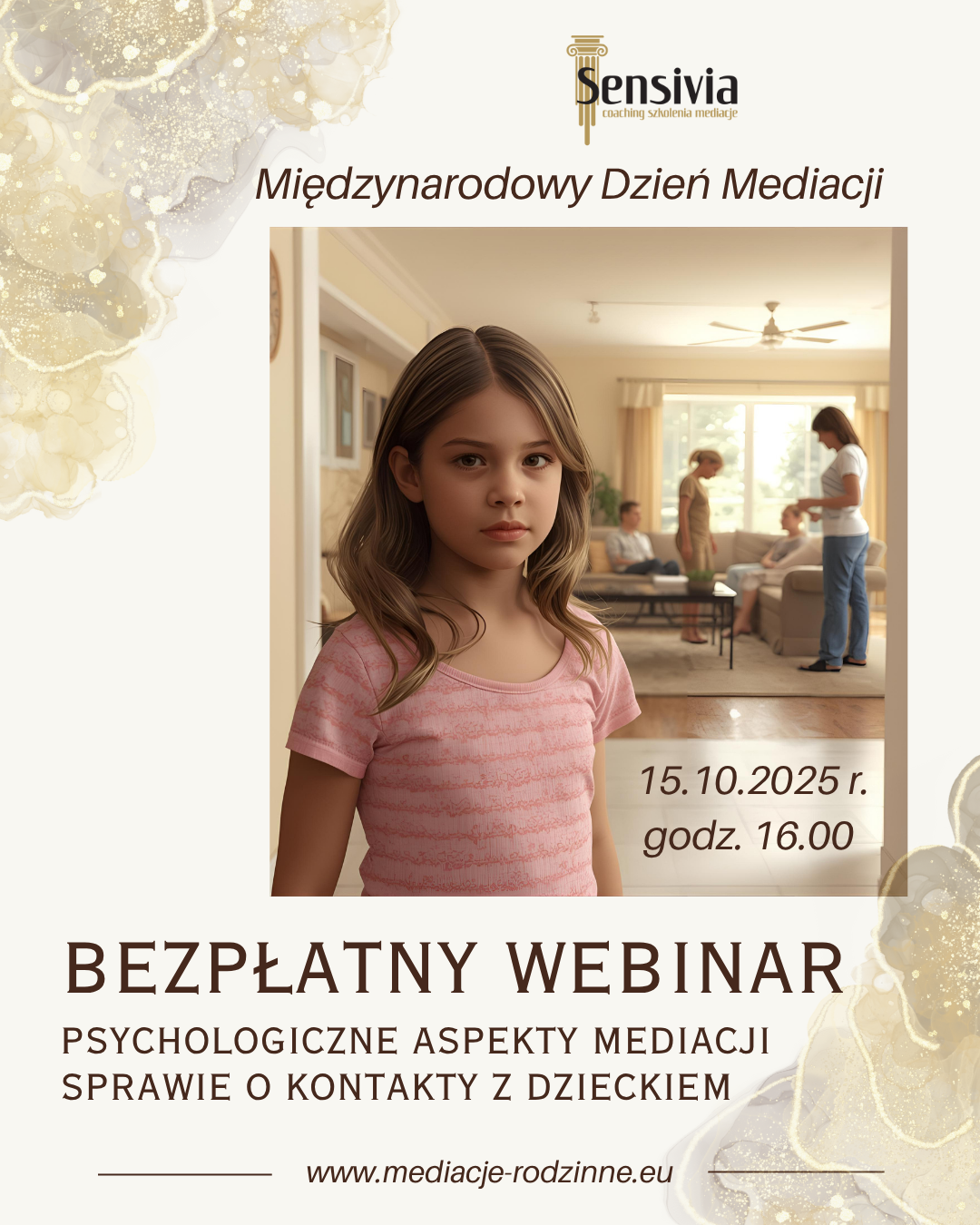 Z okazji obchodów Międzynarodowego Dnia Mediacji zapraszam wszystkie osoby zainteresowane tematyką mediacji rodzinnych na bezpłatny webinar „Psychologiczne aspekty mediacji w sprawie o kontakty z dzieckiem”.