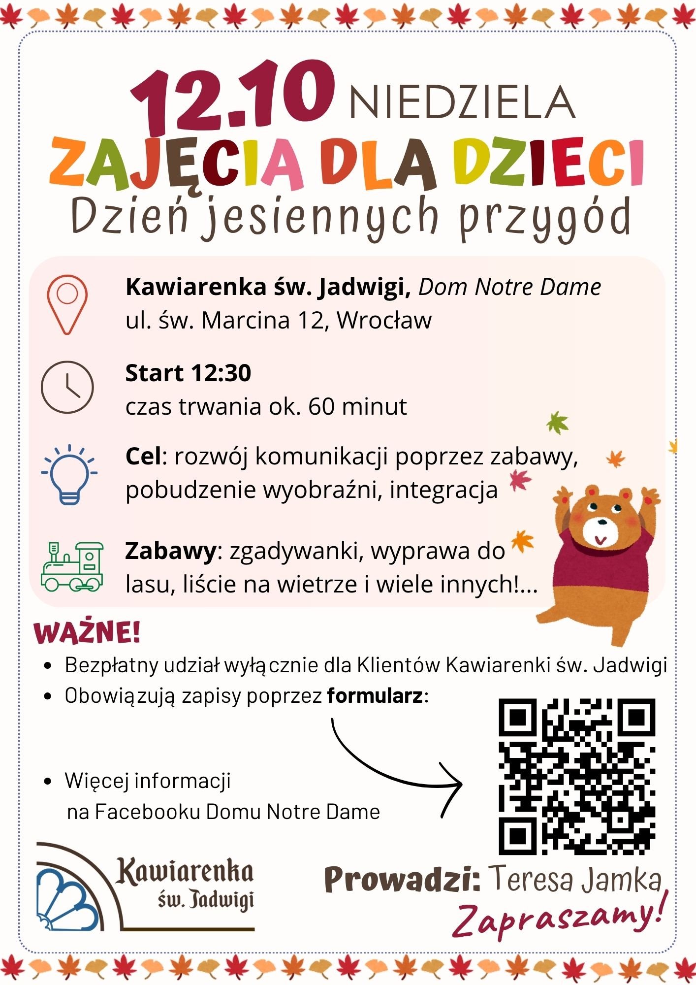 Niedzielne zajęcia dla dzieci w Kawiarence św. Jadwigi, to okazja do miłego spędzenia czasu dla całej rodziny! Na najmłodszych gości czekają edukacyjne gry i zabawy z elementami logopedii, a na starszych przepyszne, domowe ciasta oraz filiżanka aromatycznej kawy. Dzień będzie przepełniony jesienną atmosferą – od sezonowych wypieków i napoi, po zabawy inspirowane porą roku. Serdecznie zapraszamy do uczestnictwa!
