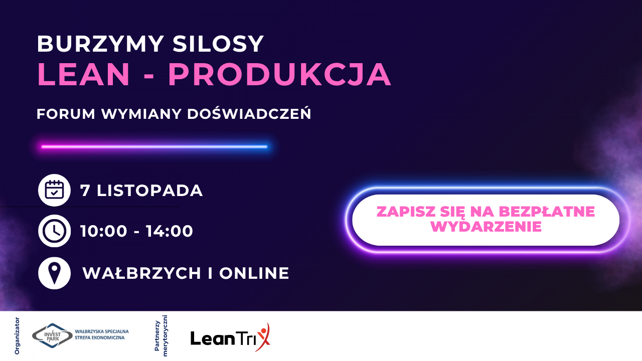 Podczas wydarzenia „Burzymy Silosy: Lean – Produkcja” wspólnie zastanowimy się, jak budować mosty, a nie mury. Uczestnicy dowiedzą się, jak: tworzyć wspólne cele i wskaźniki między działami, wzmocnić zaufanie między Lean a Produkcją, wdrażać Lean tak, by realnie wspierał wyniki operacyjne, rozwijać kompetencje liderów nowej ery, którzy budują współpracę, a nie rywalizację. To wydarzenie to praktyczna dyskusja ludzi z produkcji, Lean i zarządzania, bez teorii – z realnymi przykładami i wymianą doświadczeń.