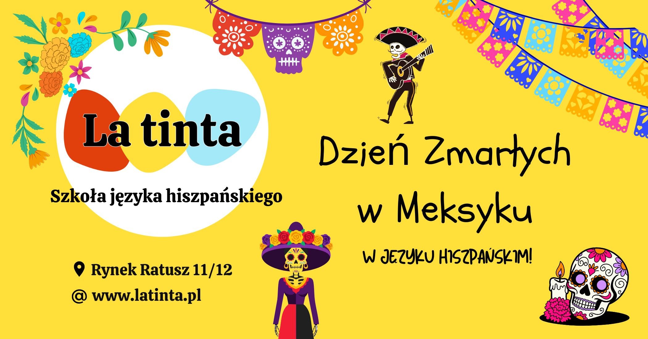 Halloween? Znamy to. Ale w La Tinta świętujemy coś znacznie ciekawszego... meksykański Día de los Muertos! To święto pełne kolorów, muzyki i życia, w którym wspomina się bliskich z uśmiechem. Nasza lektorka z Meksyku opowie o jego znaczeniu i pokaże, jak wygląda prawdziwa meksykańska tradycja. Będzie piękna dekoracja, coś pysznego do spróbowania, dużo hiszpańskiego i konkurs z nagrodą. Przyjdź, odkryj magię Meksyku i przekonaj się, że Día de los Muertos to coś więcej niż Halloween!