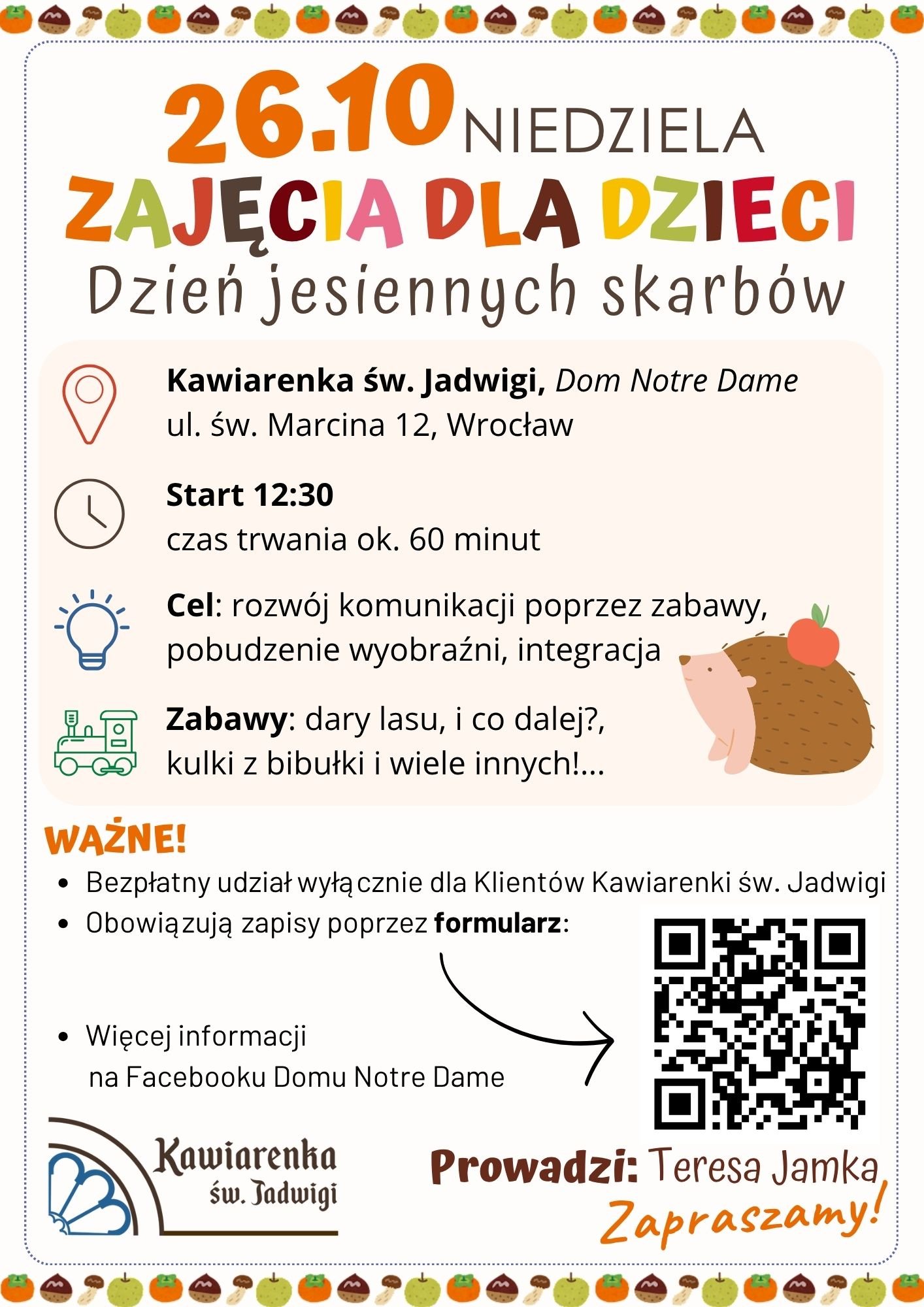 Niedzielne zajęcia dla dzieci w Kawiarence św. Jadwigi, to okazja do miłego spędzenia czasu dla całej rodziny! Na najmłodszych gości czekają edukacyjne gry i zabawy z elementami logopedii, a na starszych przepyszne, domowe ciasta oraz filiżanka aromatycznej kawy. Dzień będzie przepełniony jesienną atmosferą – od sezonowych wypieków i napoi, po zabawy inspirowane porą roku.