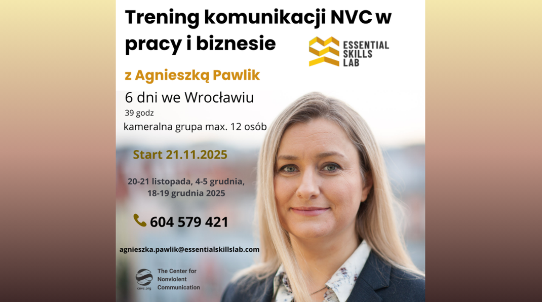 Nonviolent Communication (NVC) to metoda komunikacji precyzyjnej i empatycznej, wykorzystywana w biznesie i środowisku pracy na całym świecie. Dzięki niej zredukujesz liczbę nieporozumień, zbudujesz zaufanie i zwiększysz jakość współpracy – bez presji, stresu i niepotrzebnych konfliktów.