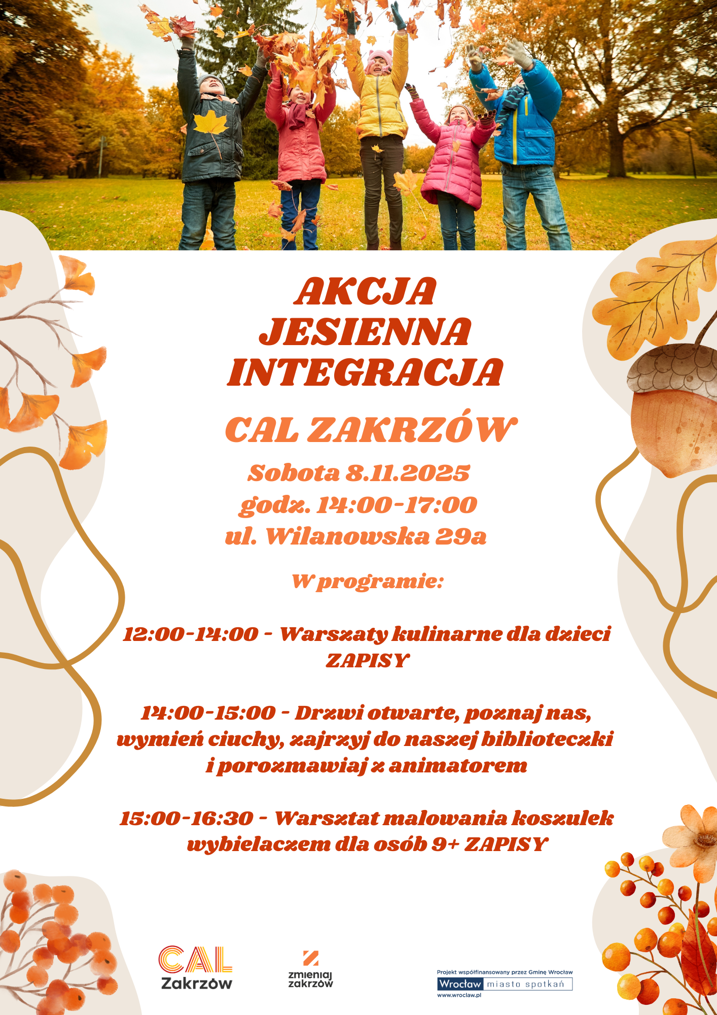 Zapraszamy na JESIENNĄ INTEGRACJĘ w CAL-u Zakrzów! To idealny moment, żeby wyjść z domu, poczuć klimat jesieni i spędzić czas wśród ludzi. Szykujemy atrakcje, w których można się pobrudzić mąką, zrobić coś kreatywnego, przewietrzyć szafę i po prostu pobyć razem. Zabierz dziecko, przyjaciela, sąsiadkę albo wpadnij solo – u nas zawsze znajdzie się miejsce przy wspólnym stole. Niech ta sobota będzie twórcza i ciepła, nawet jeśli za oknem jest inaczej. Centrum Aktywności Lokalnej Zakrzów jest prowadzone przez Stowarzyszenie Zmieniaj Zakrzów i współfinansowane ze środków Gminy Wrocław (www.wroclaw.pl).