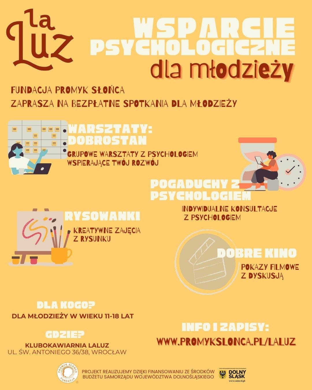 Masz mniej niż 18 lat i zmagasz się ze stresem, presją, trudnościami w relacjach? Dołącz do bezpłatnych warsztatów psychologicznych Fundacji Promyk Słońca prowadzonych w ramach projektu „LaLuz. Wsparcie psychologiczne młodzieży”.