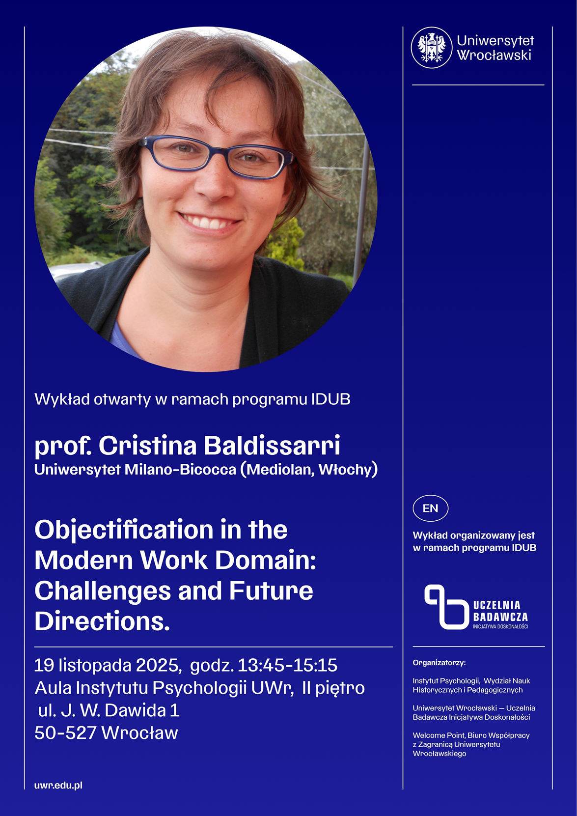 Prof. Baldissarri przyjedzie do Instytutu Psychologii w ramach programu IDUB Uniwersytet Badawczy – Uniwersytet Wrocławski na zaproszenie dr hab. Kingi Lachowicz-Tabaczek, prof. UWr.