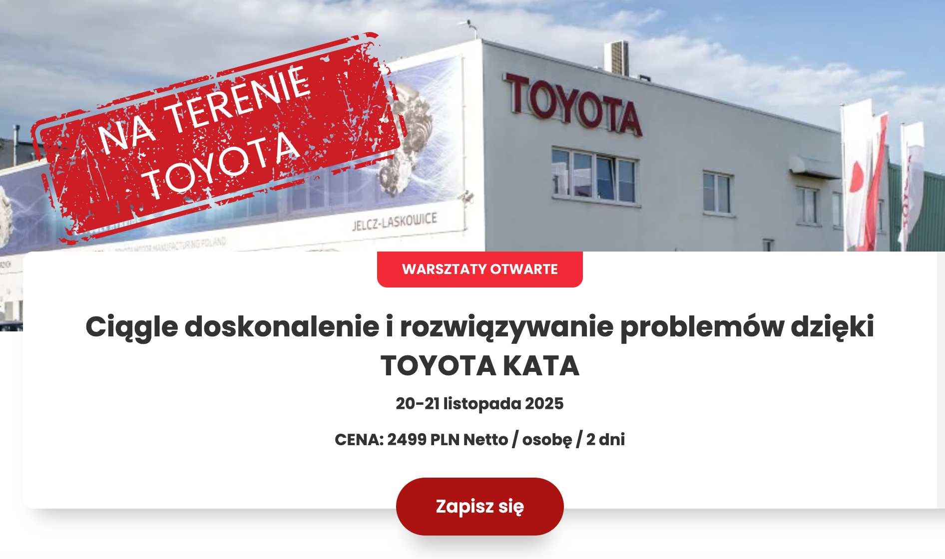 Szkolenie Kata w Toyota to unikalne, dwudniowe doświadczenie łączące naukę metody Toyota Kata z możliwością obserwacji jej realnego zastosowania w jednym z najlepszych zakładów produkcyjnych w Polsce. Program przygotowano w ścisłej współpracy z Toyota Motor Manufacturing Poland, co gwarantuje najwyższy poziom merytoryczny oraz praktyczne odniesienie do rzeczywistego środowiska produkcyjnego.