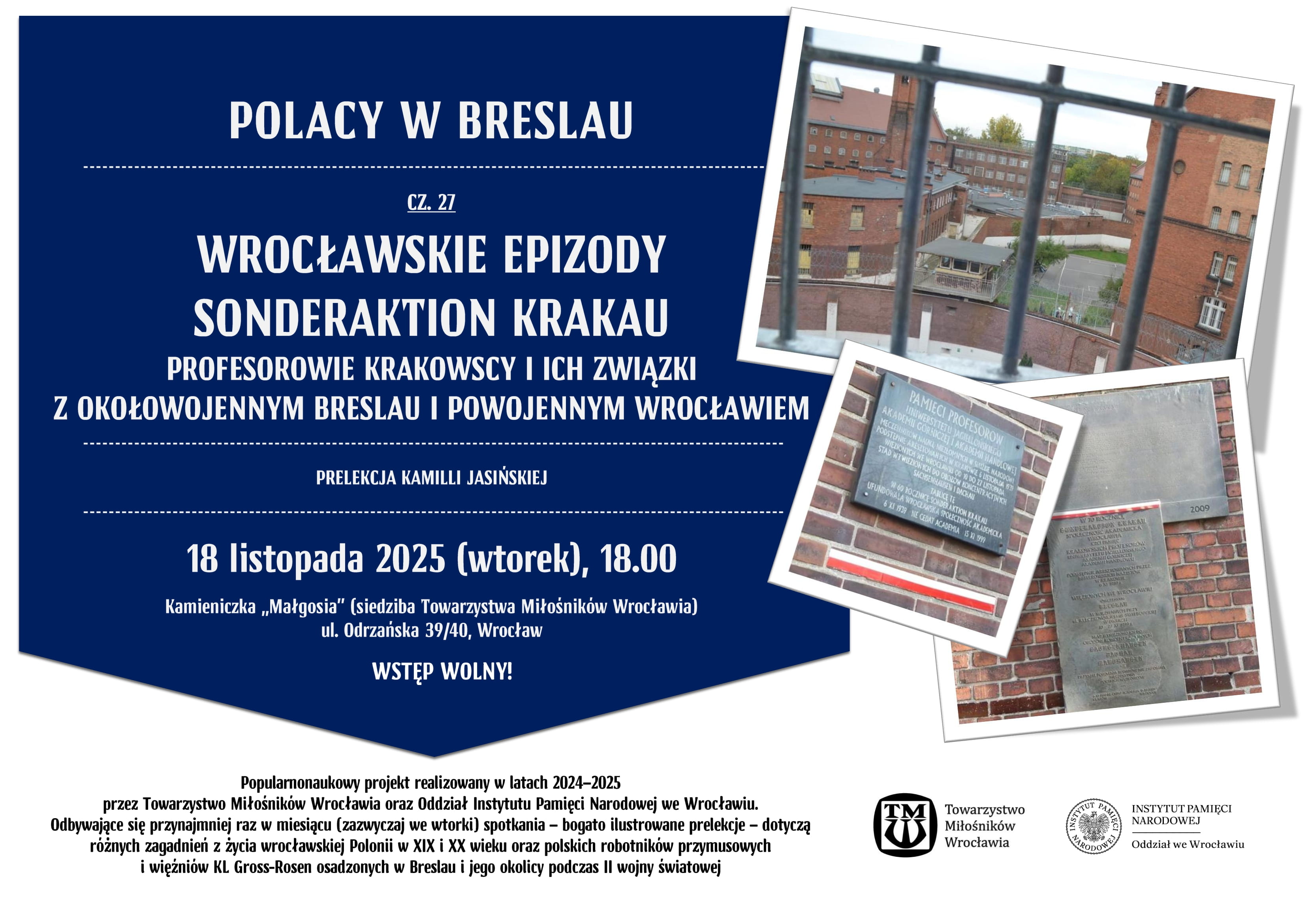 Popularnonaukowa prelekcja odbędzie się w kamieniczce "Małgosia" o godz. 18.00 i będzie ostatnim spotkaniem z cyklu POLACY W BRESLAU. W ten sposób zakończymy popularnonaukowy projekt realizowany w latach 2024–2025 przez Towarzystwo Miłośników Wrocławia oraz Oddział Instytutu Pamięci Narodowej we Wrocławiu. Odbywające się przynajmniej raz w miesiącu (zazwyczaj we wtorki) spotkania – bogato ilustrowane prelekcje – dotyczyły przede wszystkim różnych zagadnień z życia wrocławskiej Polonii w XIX i XX wieku oraz polskich robotników przymusowych i więźniów KL Gross-Rosen osadzonych w Breslau i jego okolicy podczas II wojny światowej.
