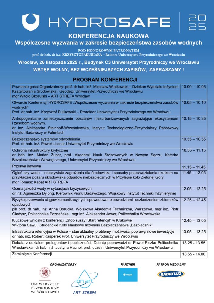 W dniu 26 listopada 2025 roku na terenie Uniwersytetu Przyrodniczego we Wrocławiu odbędzie się Konferencja Naukowa HYDROSAFE 2025 pod honorowym patronatem prof. dr hab. dr h.c. Krzysztofa Kubiaka, Rektora UPWr.