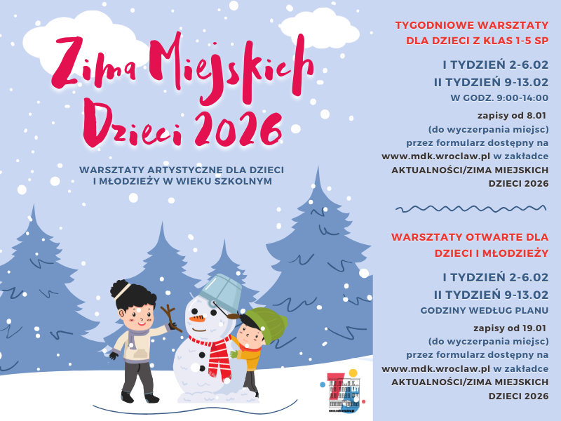 Zapisy: od 8 stycznia poprzez formularz elektroniczny na stronie www.mdk.wroclaw.pl w zakładce AKTUALNOŚCI / ZIMA MIEJSKICH DZIECI 2026